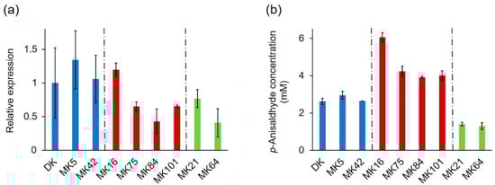 After submerged cultivation, the lyophilized mycelium of the fourteen pre-selected monokaryons and the parental dikaryon was used for the biotransformation of trans-anethole to p-anisaldehyde to analyze the alkene cleavage activity of the strains (Figure 3a). The parental dikaryon produced 2.62 mM p-anisaldehyde, which was similar to the product concentrations obtained for MK5 and MK42, while MK21 and MK64 generated an approximately two-fold lower p-anisaldehyde concentration. All other monokaryons exhibited higher alkene cleavage activities (1.5–1.7-fold) than the dikaryon, while the activity of MK16 reached a 2.5-fold value. According to their activity, and in comparison, to the results for the dikaryon, the strains were categorized into four groups: (I) low active strains (MK21 and MK64); (II) moderately active strains (DK, MK5, and MK42); (III) highly active strains (MK13, MK23, MK34, MK49, MK75, MK84, MK93, MK101); and (IV) very highly active strains (MK16).