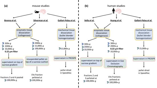- Huang, Y.; Cheng, L.; Turchinovich, A.; Mahairaki, V.; Troncoso, J.C.; Pletniková, O.; Haughey, N.J.; Vella, L.J.; Hill, A.F.; Zheng, L.; et al. Influence of species and processing parameters on recovery and content of brain tissue-derived extracellular vesicles. J. Extracell. Vesicles 2020, 9, 1785746. [Google Scholar] [CrossRef] [PubMed]