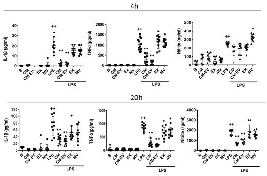 Release of pro-inflammatory mediators by mouse-derived peritoneal macrophages. Cytokines were measured by ELISA and nitrite was determined by fluorometry in cell supernatants at 4 h and 20 h of incubation with CM, CM-EV, EX, or MV in the presence or absence of LPS. B: cells incubated with control medium and not stimulated with LPS. Data are presented as mean ± SD (n = 9) from 3 independent experiments. One-way analysis of variance followed by Tukey’s post hoc test; ++ p < 0.001 versus B; * p < 0.05, ** p < 0.01 versus LPS control.