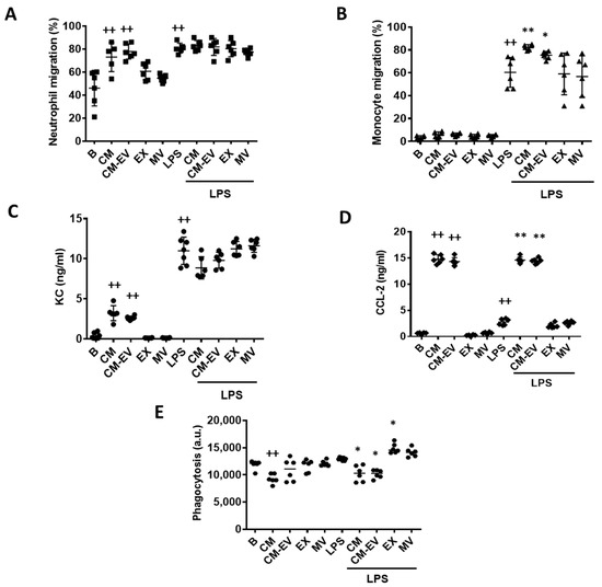 Macrophage functions. Neutrophil migration (A), monocyte migration (B), CXCL-1 levels (C), CCL-2 levels (D) and phagocytosis (E). For migration experiments, macrophages were incubated with CM, CM-EV, EX, or MV in the presence or absence of LPS for 20 h. Then, neutrophils or monocytes were added to the upper compartment of the transwells and after 4 h, the migrated cells were quantified by flow cytometry. CXCL-1 and CCL-2 were measured by ELISA in the supernatants of neutrophil or monocyte migration assays, respectively. Macrophage phagocytosis of fluorescent polystyrene beads was determined by flow cytometry. B: cells incubated with control medium and not stimulated with LPS. Data are presented as mean ± SD (n = 6) from 3 independent experiments. One-way analysis of variance followed by Tukey’s post hoc test; ++ p < 0.001 versus B; * p < 0.05, ** p < 0.01 versus LPS control.