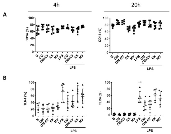 Expression of CD14 (A) and TLR4 (B). Macrophages were incubated with CM, CM-EV, EX, or MV in the presence or absence of LPS for 4 h or 20 h. Protein expression of CD14 and TLR4 was determined by flow cytometry. B: cells incubated with control medium and not stimulated with LPS. Data are presented as mean ± SD (n = 6) from 3 independent experiments. One-way analysis of variance followed by Tukey’s post hoc test; ++ p < 0.001 versus B; * p < 0.05 versus LPS control.