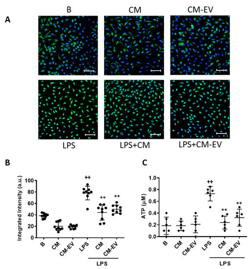 NF-κB nuclear translocation and ATP release. For NF-κB translocation, macrophages were incubated with CM or CM-EV for 30 min and immunofluorescence was determined by confocal microscopy using an NF-κB p65 XP® Rabbit (Alexa Fluor® 488 Conjugate). (A) Representative images. Microscopic magnification of the objective lens 40 x. Bar = 50 µm. (B) Quantification of nuclear translocation. For ATP release (C), macrophages were incubated with CM or CM-EV in the presence or absence of LPS for 20 h. ATP levels were determined by luminescence in the medium. B: cells incubated with control medium and not stimulated with LPS. Data are presented as mean ± SD (n = 6–9) from 3 independent experiments. One-way analysis of variance followed by Tukey’s post hoc test; ++ p < 0.001 versus B; ** p < 0.01 versus LPS control.