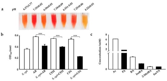 S. epidermidis (107 CFU/mL) were incubated in 10 mL rich media (10 g/L yeast extract (Biokar Diagnostics, Beauvais, France), 3 g/L TSB, 2.5 g/L K2HPO4, and 1.5 g/L KH2PO4) in the presence of AB, CEH, and CIN (Taiwan NJC Corp., Chiayi, Taiwan), respectively, under aerobic conditions at 37 °C, with shaking at 200 rpm. The rich media with AB, CEH, and CIN without bacteria were included as a control. The 0.002% (w/v) phenol red (Sigma) in rich media acted as a fermentation indicator. A color change from red-orange to yellow indicated the occurrence of bacterial fermentation, which was detected at an absorbance of 560 nm.