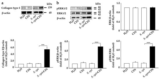 Application of a mixture of S. epidermidis and CIN induces collagen type I and p-ERK expression in mouse skin. Fermented media from S. epidermidis (S. epi) (ATCC 12228) (107 CFU/mL) were topically applied to mouse skin in the presence and absence of CIN 2%. Mice treated with H2O or CIN alone were included as a control. Protein expression of (a) collagen type I and β-actin and (b) p-ERK 1/2, ERK 1/2, and β-actin from Western blot analysis in mouse skin treated with H2O, CIN, S. epi, and S. epi+CIN is shown. Ratios of intensities of collagen type I, p-ERK 1/2, and ERK 1/2 relative to β-actin and p-ERK1/2 relative to ERK 1/2 in all the above mice groups are illustrated. Data are expressed as means ± SD (*** p < 0.005; n = 3).