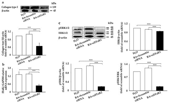 Blocking FFaR2 prevents BA-mediated collagen type I and p-ERK induction. 3T3 cells were transfected with FFaR2 (siFFaR2) or scrambled siRNA followed by treatment with and without BA for 24 h. 3T3 cells treated with H2O were included as a control. (a) Protein expression analyzed by the Western blot analysis of collagen type I and the ratio of intensities of collagen type I to β-actin. (b) The expression of the FFaR2 gene relative to the GAPDH gene by RT-PCR analysis. (c) Protein expression analyzed by the Western blot analysis of p-ERK1/2, ERK1/2, and β-actin and the ratio of intensities of pERK1/2 and ERK/2 relative to β-actin and the ratio of intensity of p-ERK1/2 to ERK1/2 in the above groups are displayed. Data are expressed as means ± SD (*** p < 0.001; n = 3).
