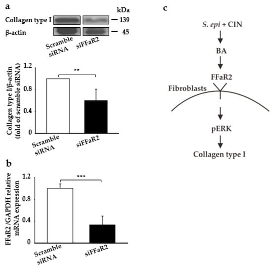 BA, one of the SCFAs from the S. epidermidis fermentation of CIN, was found to have a potential role in the BA stimulation of MAP kinases and collagen biosynthesis in cultured human skin fibroblasts [,]. Moreover, it has been documented that BA mediates its chemoattractant anti-inflammation and immunoregulatory role by directly activating its cognate GPR43 (also known as FFaR2) []. To further evaluate the role of BA in collagen and p-ERK expression and interaction with its cognate FFaR2, we further knocked down FFaR2 with small interfering FFaR2 (siFFaR2) (5 µM) transfection into 3T3 mouse fibroblast cells, followed by treatment with BA. A significant upregulation in collagen type I and p-ERK was found upon the application of butyrate injected with scrambled small interfering ribonucleic acid (siRNA) compared to the control mouse treated with H2O alone (Figure 3). However, a notable decrease in collagen type I and p-ERK was detected in FFaR2-deficient 3T3 cells, which did not recover even after butyrate application (Figure 3a,c). We also confirmed the FFaR2 gene knockdown by measuring the relative expression of messenger ribonucleic acid (mRNA) by real-time polymerase chain reaction (RT-PCR) analysis and FFaR2 expression (Figure 3b and Figure S1). Additionally, the upregulated level of collagen expression upon the treatment of 3T3 cells with fermented media from CIN fermentation by S. epidermidis was downregulated upon knocking down FFaR2 (Figure S2). Studies on the effect of BA on collagen expression stated that collagen biosynthesis is regulated through ERK signaling in human dermal fibroblasts [,]. These results show that BA, the fermentation metabolite, induces collagen type I-pERK expression in mouse fibroblasts through BA–FFaR2 interaction.