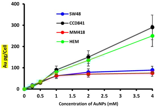 Inductively coupled plasma mass spectrometry (ICP MS) was used to determine the picograms (pg) of Au atoms that were accumulated per cell for human colorectal adenocarcinoma (SW48), colon epithelial (CCD841) cells, melanoma (MM418-C1), and human epidermal melanocytes (HEM). The cells were incubated with different concentrations (control (0), 0.25, 1, 2, and 4 mM) of AuNPs for 24 h prior to ICP MS measurement. As expected, in cells exposed to the control media (0 mM AuNPs) no gold was detected (Figure 1). The level of gold that accumulated in all the cells was proportional to the external media concentration. Both non-cancerous cells (CCD841 and HEM) accumulated similar levels of Au and this was significantly higher than that of their respective cancerous counterparts (SW48 and MM418-C1). The cellular uptake of 15 nm AuNPs by both cancer cell lines, i.e., SW48 and MM418-C1 approached saturation at 1 mM. However, no saturation level was observed in normal cell lines up to 4 mM for AuNPs. Based on these results, the concentration of 1 mM of AuNPs was chosen for subsequent experiments.