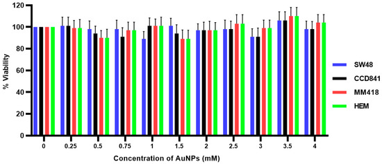 Effect of AuNPs on the viability of human colon adenocarcinoma (SW48) and melanoma (MM418-C1) cell lines compared to their non-cancerous counterparts (CCD841 and HEM cells). The cells were treated with 0–4 mM AuNPs for 48 h and cell viability (viability%) was determined using the MTS assay. No significant differences in cell viability were seen in all cell types at different concentration of AuNPs (p > 0.05). Results expressed are the mean ± SEM of 3 replicates.