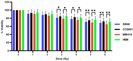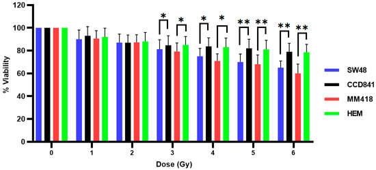 Effect of ionizing radiation (IR) on the viability of human colon adenocarcinoma (SW48) and melanoma (MM418-C1) cell lines compared to their non-cancerous counterparts (CCD841 and HEM cells). The cells were irradiated with 0–6 Gy X-rays and viability % was measured 48 h post-irradiation using the MTS assay. Results are expressed as the mean ± SEM of 3 replicates. Significance of different treatments compared to control is represented by black lines shown as * p < 0.05 and ** p < 0.01.
