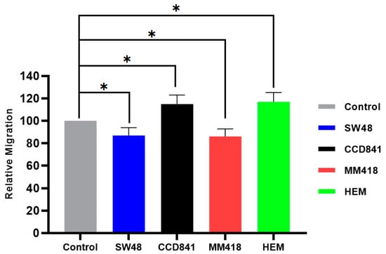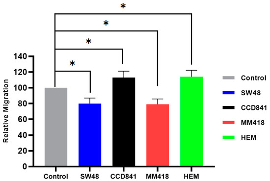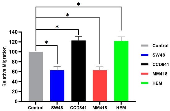 The effect of AuNPs on the migration of human colon adenocarcinoma (SW48) and melanoma (MM418-C1) cell lines compared to their non-cancerous counterparts (CCD841 and HEM cells). The cells were treated with 1 mM AuNPs 24 h prior to the scratch test. Control represents the corresponding untreated cells in which the size of the gap closure over 24 h was expressed as 100%. Results were calculated as a percentage of that of the corresponding untreated controls over the 24 h period and are expressed as the mean ± SEM of 3 replicates. Significance of different treatments compared to the untreated control is represented by black lines shown as * p < 0.05.