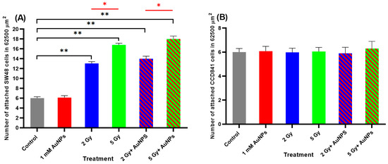 Effect of AuNPs and/or IR on the adhesion of (A) SW48 and (B) CCD841 cells in Vitro. Cells were treated with 1 mM AuNPs 24 h and/or 2 and 5 Gy (6 MV X-rays) and after 24 h the cells were trypsinised and plated in 6-well plates. After 4 h, the number of adhered cells in a 62,500 µm2 area were counted. Results are expressed as the mean ± SEM of 3 replicates. Significance of different treatments compared to the untreated control is represented by black lines shown as ** p < 0.01 and red lines shown as * p < 0.05.