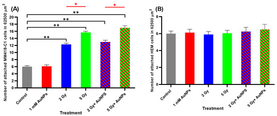 Effect of AuNPs and/or IR on the adhesion of (A) MM418-C1 and (B) HEM cells in Vitro. Cells were treated with 1 mM AuNPs 24 h and/or 2 and 5 Gy (6 MV X-rays) and after 24 h the cells were trypsinised and plated in 6-well plates. After 4 h, the number of adhered cells in a 62,500 µm2 area were counted. Results are expressed as the mean ± SEM of 3 replicates. Significance of different treatments compared to the untreated control is represented by black lines shown as ** p < 0.01 and red lines shown as * p < 0.05.