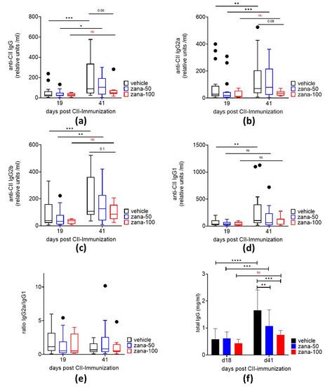 Further, total IgG increased significantly over the observation period in the vehicle and zana-50 treatment group. An inhibition of IgG production was measured in the zana-100 group between day 19 and day 41. On day 41, the total IgG concentrations were significantly reduced after zana-50 and zana-100 treatment compared to the controls (Figure 2f).