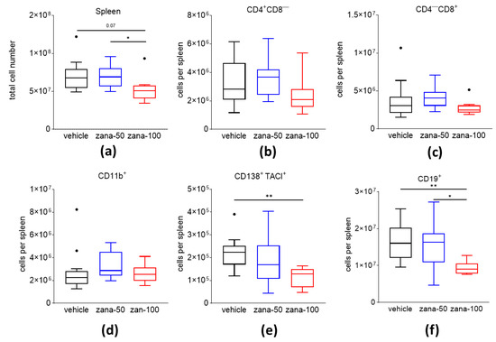 A complex network of cells such as T cells, B lineage cells, and myeloid cells is involved in the pathogenesis of RA. Recent data demonstrated that B cells and autoantibody-secreting plasma cells might be potential targets not only for the treatment of systemic lupus erythematosus (SLE) and multiple sclerosis (MS), but also for RA [37]. We investigated the effect of zanamivir on numbers of splenic T cells, CD19+ B cells, CD138+/TACI+ plasma cells (PCs), and CD11b + myeloid cells in CIA. Overall, a dose of 100 mg/kg of zanamivir lowered the splenic cell numbers significantly compared to the control group (Figure 3a). Absolute numbers of CD4+CD8−-T cells, CD4-CD8+-T cells, and also CD11b+cells were not altered between the groups (Figure 3b–d). However, when we analyzed the numbers of CD138+/TACI+ plasma cells and CD19+ B cells, we observed significantly reduced numbers after zana-100 treatment compared to the controls (Figure 3e,f).