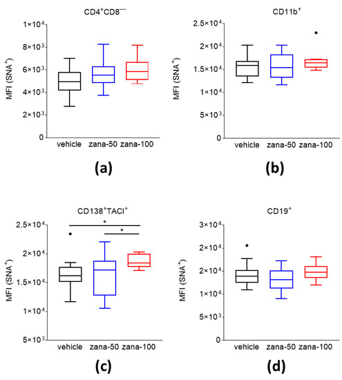 An increased level of alpha-(2,6)-sialic acids is observed on the cell surface of CD138+/TACI+ plasma cells after zanamivir treatment in CIA. Levels of (2,6)-SA residues on cell subsets—(a) CD4+CD8−T cells, (b) CD11b+ cells, (c) CD138+/TACI+ cells, and (d) CD19+cells—were measured by flow cytometric analysis. Data are presented as Tukey’s box- and whisker plots. Observations outside the whiskers are considered outliers and presented as black dots. * p < 0.05. Welch’s ANOVA test with Dunnett’s T3 multiple comparisons was used for statistical analysis.