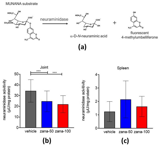 Next, a fluorescence-based assay was used to assess the neuraminidase activity in joint and spleen extracts of CIA mice. The assay is based on the conversion of a fluorogenic substrate (2′-(4-methylumbelliferyl)-α-D-N-acetylneuraminic acid (MUNANA)) into α-D-N-neuraminic acid and the fluorescent molecule 4-methylumbelliferone in the presence of neuraminidase (Figure 6a) [39]. Tissue extracts of hind paws and spleens were prepared immediately after the euthanization of the animals and applied to the assay. Neuraminidase activity in samples was calculated as µU/mg total protein. The joint extracts of vehicle-treated mice showed significantly higher neuraminidase activity compared to the joint extracts of zana-50 and zana-100-treated mice (Figure 6b). Overall, the joint extracts of CIA mice had a more than 10-fold higher neuraminidase activity than spleen extracts. Further, in spleens no significant differences were observed between the groups (Figure 6c).