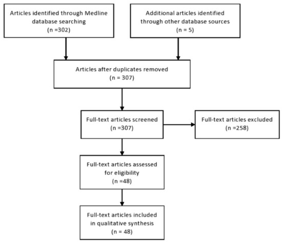 Three hundred two articles were found from Medline. An additional five articles were retrieved from three other sources. No duplicates were identified. A total of 307 articles were retrieved, and the title and abstract of each article was screened for appropriateness. Two hundred fifty-nine articles were removed by application of the exclusion criteria. Forty-eight full-text articles were included in qualitative synthesis (Figure 1). All selected studies were assigned low risk for the domain of baseline characteristics and also had a low risk of selective outcome reporting, as well as a low risk of other sources of bias.