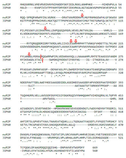 Alignment between the amino acid sequences for JIP60 and nuRIP. Red arrows point towards the active site residues for the RIP domain. The green bar shows the location of the nuclear localization signal in nuRIP. The vertical red lines indicate the end of the RIP domain for the two RIPs. Asterisks refer to residues that are fully conserved, colons indicate residues with highly similar properties, dots indicate residues with weakly similar properties.
