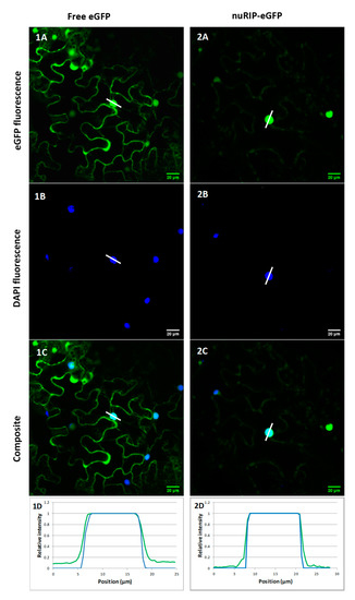 Subcellular localization of free eGFP construct (left) and nuRIP-eGFP fusion construct (right); The eGFP fluorescence is shown in panels 1–2A. The nuclei were stained with 4′, 6-diamidino-2-phenylindole (DAPI) in panels 1–2B. Composite images of both channels are shown in panels 1–2C. Panels 1–2D show the relative intensities of DAPI (blue) and eGFP (green) along the white lines in 1–2A, 1–2B and 1–2C. The y-axis represents the normalized fluorescence, while the x-axis represents the distance along the white line.
