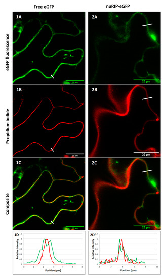 Zoom in of subcellular localization of free eGFP construct (left) and nuRIP-eGFP fusion construct (right). The eGFP fluorescence is shown in panels 1–2A. The cell wall was stained with propidium iodide in panels 1–2B. Composite images of both channels are shown in panels 1–2C. Panels 1–2D show the relative intensities of propidium iodide (red) and eGFP (green) along the white lines in 1–2A, 1–2B and 1–2C. The y-axis represents the normalized fluorescence, while the x-axis represents the distance along the white line.