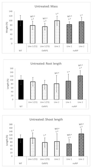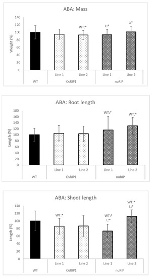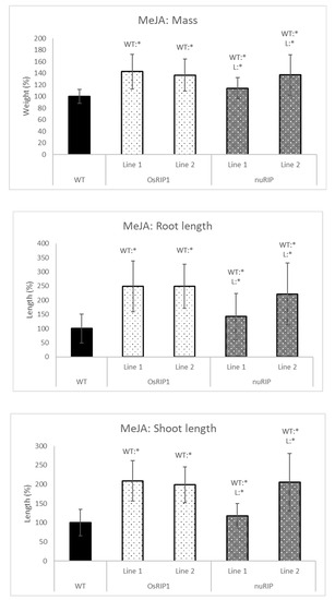 In addition, seedlings from transgenic lines and wild-type plants were subjected to hormone treatments with ABA and MeJA. Seedlings were treated with ABA by adding 2 µM ABA to the solution in which the seedlings were grown (Figure 7). No remarkable differences were observed in the growth of the transgenic lines overexpressing OsRIP1 compared to the wild-type plants after ABA treatment. Seedlings from line 2 revealed a lower mass, and plants from line 1 had a shorter shoot compared to wild-type seedlings. Contrasting results were obtained for the two lines overexpressing nuRIP. Seedlings from line 1 had a lower shoot length, while those from line 2 clearly had a longer shoot when compared to wild-type plants. Both nuRIP lines yielded longer roots than the wild-type plants.
