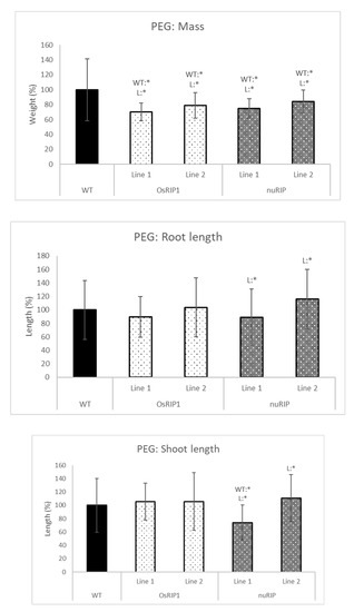Total mass, shoot and root length of one-week-old plants from different transgenic lines subjected to 20% PEG-6000 compared to those of wild-type. WT:* refers to a significant difference to wild-type plants. L:* indicates a significant difference to the other transgenic line of the same construct. The histogram is based on averages; error bars represent the standard deviation. Each data point is gathered from 50 plants per line.