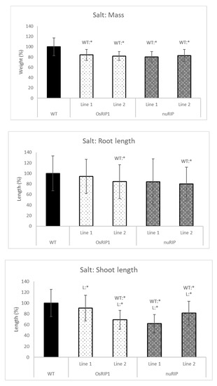 Total mass, shoot and root length of one-week-old plants from different transgenic lines subjected to 150 mM salt compared to those of wild-type. WT:* refers to a significant difference to wild-type plants. L:* indicates a significant difference to the other transgenic line of the same construct. The histogram is based on averages; error bars represent the standard deviation. Each data point is gathered from 50 plants per line.