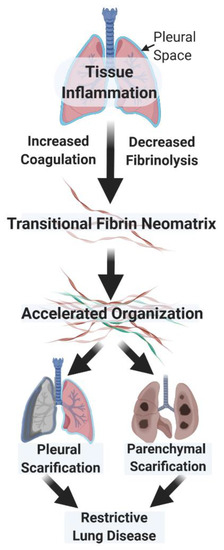 In both lung and pleural injury, plasminogen activator inhibitor-1 (PAI-1) appears to play a critical role in outcomes and the process of accelerated organization and scarification. PAI-1 is capable of inhibiting PAs, tPA, and uPA (two chain or active urokinase) within the injured lung and pleural space [1,2]. The activity of these PAs decreases in relation to the severity [13,14] of injury in both compartments [2,15,16]. PAI-1 thereby impedes local fibrinolysis and promotes extravascular fibrin deposition in the injured lung and pleural space [2]. Tissue factor expression by lung epithelial and/or mesothelial cells and lung fibroblasts triggers activation of the coagulation system in these injuries, while fibrinolytic activity is suppressed in resident cells mainly by increased expression of PAI-1 driven by proinflammatory mediators released into the local microenvironment [2,17,18,19,20,21,22,23,24]. These observations and those of other laboratories [13,25,26,27,28,29,30,31,32,33,34,35,36,37,38,39,40,41,42,43,44,45,46,47] support the concept that increments of local coagulation and concurrent decrements of fibrinolysis occur in inflammation and favor the formation and retention of fibrinous extracellular fibrin. Protracted collections of extravascular fibrin can organize with scarification in the injured lung or pleural space [1].
