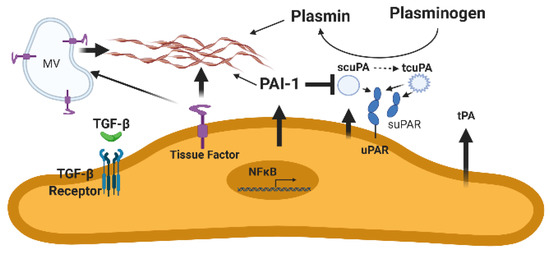 The mesothelium and disordered fibrin turnover. Increased TGF-β expression in response to injury increases plasminogen activator inhibitor-1 (PAI-1) expression. In the aggregate, PAI-1 expression and activity are overexpressed in exudative pleural effusions. This increase in PAI-1 reduces plasminogen conversion to active plasmin by single chain urokinase plasminogen activator (scuPA), two chain urokinase plasminogen activator (tcuPA), and tissue plasminogen activator (tPA). These effects decrease local expression of fibrinolytic activity, which decreases fibrin degradation, leading to aberrant extravascular fibrin deposition. scuPA or the high molecular weight form of tcuPA can bind uPA receptor (uPAR) and be localized to the cell surface or be present unbound in pleural fluids. NFκB is NF kappa B, a signaling mediator that is in particular implicated in the transcriptional regulation of PAI-1 expression by pleural mesothelial cells. MV is microvesicles, which have been shown to contain TF. Brown strands indicate fibrin.