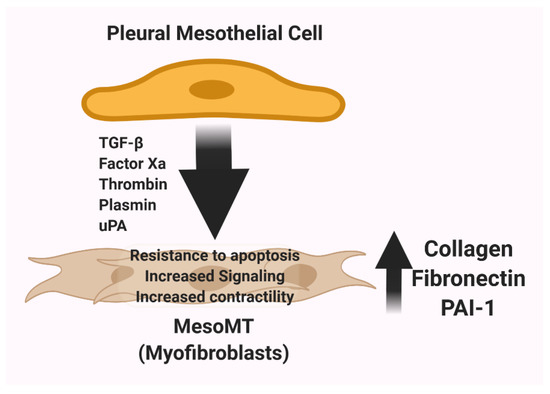 Induction and consequences of MesoMT. Upon stimulation by TGF-β, Factor Xa, thrombin, uPA, or plasmin, pleural mesothelial cells assume a mesenchymal phenotype by undergoing MesoMT. The population of cells undergoing MesoMT expands in the setting of organizing pleural inflammation. Cells undergoing MesoMT elongate compared to unstimulated pleural mesothelial cells and assume the functionality of myofibroblasts and increase expression of neomatrix components including collagen, fibronectin, and PAI-1.