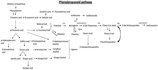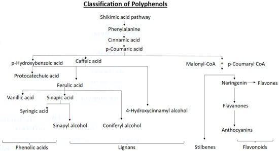 Plant secondary metabolites are generally divided into three broad classes: terpenoids, phenolics and alkaloids, with phenolics (polyphenols) being the largest, diverse and most widely distributed class among them. Several thousand polyphenolic compounds are found in plants, synthesized via the shikimic acid-derived phenylpropanoid and/or polyketide pathways []. They have a basic structure consisting of benzene ring with a hydroxyl group attached, without any nitrogen-based functional group [,,]. L-phenylalanine is the primary compound in this pathway to be synthesized and form the basis for downstream synthesis of other polyphenols (Figure 1). Major groups of polyphenols include flavonoids (C6-C3-C6), phenolic acids (C6-C1), stilbenes (C6-C2-C6) and lignans (C6-C3). Polyphenols not only contribute to the flavor, color, odor, astringency, oxidative stability and bitterness [,] of different plant parts, but also play a critical role as plant chemical defenses [].
