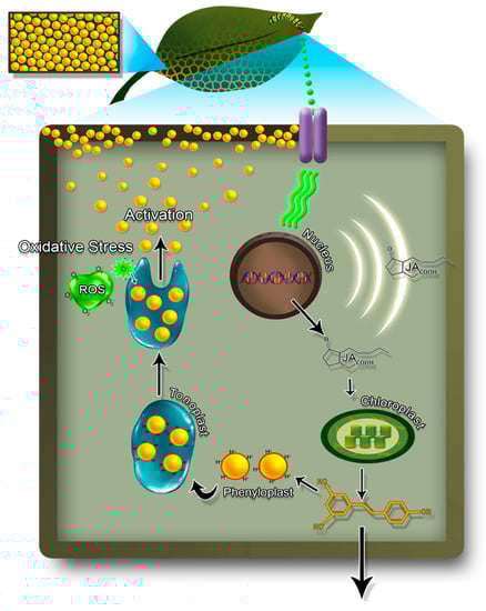 Plants have also been found to sequester phenolic compounds in the cell vacuole, to swiftly combat any future attack [,,]. These compounds are not only toxic to herbivores but are also found to be toxic to plants as well. Consequently, plants tend to store them in special compartments known as phenyloplasts; the cells of thylakoid membrane which are produced via redifferentiation of primary cells. In order to store polyphenols in these cells, they are first detoxified by conjugating it with glycosides to form phenylglycoside, making them hydrophilic to remove their toxicity []. These phenyloplasts are progressively filled with phenylglycosides until they become mature enough to be released outside the chloroplast []. Once filled with polyphenolic compounds, these molecules move inside the vacuoles. At the onset of herbivory, signaling molecules such as reactive oxygen species (ROS) are produced by insect oral secretions [] leading to oxidative stress inside a cell, forcing phenyloplasts to break their outer protective layer, thus releasing various polyphenolic compounds. []. These compounds released from the vacuole, cross-link and/or polymerize cell wall, which imparts mechanical strength and rigidity to the plants, posing a harder barrier for herbivores to continue feeding by chewing and biting. PPO also oxides the secondary metabolites to form polymerized quinones [] that act as proteinase inhibitors which bind with several essential enzymes inside the insect body, obstructing several essential physiological processes, digestive ability and nutritional uptake [].