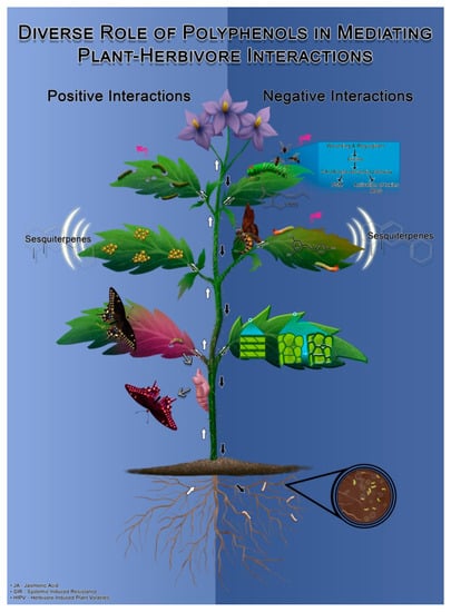 Schematic illustrating the wide gamut of herbivory related functions performed by polyphenols in plants. Plants produce polyphenols at the advent of adverse conditions such as biotic and abiotic stresses. Herbivory causes abrasions, wounds, and tissue loss which act as signal for the production of polyphenols. Moreover, the saliva or regurgitant from herbivores contain peroxidases which act as elicitors for the activation of different signaling pathways []. These secretions activate different plant hormones and signaling pathways such as jasmonic acid, salicylic acid and octadecanoid pathway [] which generate and transmit signals to all the parts of plants which is depicted by bi-directional arrows running throughout the plant leading to generation of Systemic Induced Resistance (SIR) in the plants []. The production of polyphenols also leads to synthesis of sesquiterpenes for defense priming of the neighboring plants. Both positive and negative impacts are being illustrated on the plant with left and right sides of the schematic respectively. Polyphenols generally have anti-feedent and anti-deterrent effect on most of the insects. Flavonoids (class of polyphenols) and tannins have cascading effects on the feeding and oviposition activity of tobacco hornworm caterpillar [Manduca sexta L.; [,], also protects plants against the damaging herbivores by releasing herbivore-induced plant volatiles (HIPV) attracting their predators and parasitoids []. Activation of defense mechanisms also leads to the production of reactive oxygen species (ROS) which ultimately lead to the formation of polyphenol oxidase and subsequent synthesis of compounds such as proteinase inhibitors preventing the digestibility of tissues by cross-linking and polymerizing the cells walls with alkylated amino acids. Polymerization of cinnamyl alcohol into lignin by polyphenol oxidase (formed due to activation and synthesis of polyphenols) deposits lignin in leaves and fruits which also confers resistance to the plants []. These chemical toxins are also observed to have negative impacts on activity and functionality of microbes, thus indirectly affecting their symbiotic insects as well []. Polyphenols are also observed to affect the herbivores positively; thus, playing dual role in plant-insect relationship dynamics. Flavanone glycosides present in carrot (Daucus carota L.; Apiaceae) acts as oviposition stimulant for black swallowtail butterfly (Papilio polyxenes Fabricius) by releasing volatiles which attract the insects to lay eggs [], and sequestration of flavone glucosides in the wings of lycaenid butterfly (Polyommatus bellargus Rottemburg) aiding them in visual communication and mate recognition. Illustration by Annette Diaz, conceptualized by Ishveen Kaur and Japneet Kaur.