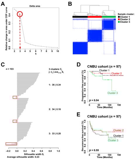 - Wilkerson, M.D.; Hayes, D.N. ConsensusClusterPlus: A class discovery tool with confidence assessments and item tracking. Bioinformatics 2010, 26, 1572–1573. [Google Scholar] [CrossRef] [PubMed]