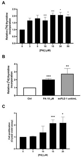 In the present work, we show that PA stimulates DNA synthesis and cell division in C2C12 myoblasts, a murine satellite cell line commonly employed to investigate skeletal muscle cell biology. The stimulation of DNA synthesis was concentration dependent, reaching maximal values at 15 μM PA after 16 h of incubation (Figure 1A). Likewise, the treatment of C2C12 cells with exogenous phospholipase D (exPLD), which generates PA at the plasma membrane of cells, also stimulated DNA synthesis in the myoblasts (Figure 1B). Cell proliferation was also determined by staining the myoblasts with crystal violet, which is a reliable assay to estimate the cell number of adherent cells []. Treatment with PA for 16 h significantly increased cell proliferation, with optimal stimulation being attained at 15 µM PA (Figure 1C).