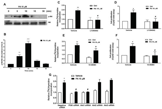 To investigate the mechanisms by which PA exerts is mitogenic actions, we tested the effects of this phospholipid on the stimulation of PI3-K/Akt and MEK/ERK1-2, which are two major signaling pathways implicated in the regulation of cell proliferation by growth factors [,]. The treatment of C2C12 myoblasts with PA caused a rapid and time dependent phosphorylation of Akt (at Ser 473), which is a kinase downstream of PI3-K activation (Figure 2A,B). To test whether this pathway is involved in the mitogenic effect of PA, the myoblasts were preincubated with selective inhibitors of PI3-K or Akt and DNA synthesis was determined after stimulation with PA. Figure 2, panels C to F, shows that the selective PI3-K inhibitor LY294002, or the blockade of Akt activity with 10-DEBC, a specific inhibitor of this kinase, substantially reduced the incorporation of [3H]thymidine into DNA and the increase in cell number that were elicited by PA. Likewise, the preincubation of these cells with specific siRNAs to silence the genes encoding PI3-K or Akt1 completely blocked the stimulation of DNA synthesis by PA, suggesting that the PI3-K/Akt1 pathway is implicated in the mitogenic action of PA. Knockdown of Akt2 or Akt3 were without effect, indicating that Akt1 is the relevant isoform involved in this pathway (Figure 2G).