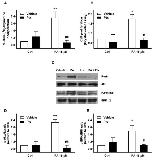 Pertussis toxin inhibits PA-stimulated myoblast proliferation and Akt and ERK1/2 phosphorylation. Myoblasts were serum-starved in DMEM supplemented with 0.1% BSA for 24 h. (A) Cells were preincubated for 16 h with 0.5 μg/mL pertussis toxin (Ptx) and then further treated with 15 μM PA or vehicle for 16 h, as indicated. [3H]Thymidine incorporation was measured as described in the Materials and Methods section. Results are expressed relative to the control value without agonist and are the mean ± SEM of 3 independent experiments performed in triplicate. (** p < 0.01, control versus PA-treated cells, ## p < 0.01; PA-treated cells versus PA-treated cells in the presence of Ptx). (B) Cells were treated as in panel A. Cell proliferation was determined by staining the myoblasts with crystal violet as described in the Materials and Methods section. Results are expressed relative to the control value without agonist and are the mean ± SEM of 3 independent experiments performed in triplicate. (* p < 0.05, control versus PA-treated cells, # p < 0.05; PA-treated cells versus PA-treated cells in the presence of Ptx). (C) C2C12 cells were preincubated for 16 h with 0.5 μg/mL Ptx. The myoblasts were then challenged with 15 μM PA or vehicle for 5 min, as indicated. Cell lysates were analyzed by western blotting as described in the Materials and Methods section. Phosphorylation of Akt (Ser473) and ERK were determined using specific antibodies to phospho-Akt (P-Akt), or phospho-ERK1/2 (P-ERK1/2). Equal loading of protein was monitored using specific antibodies to total Akt and ERK1/2. Panel C shows a representative blot of three independent experiments. (D,E) Results of scanning densitometry of the exposed films. Data are expressed as arbitrary units of intensity relative to the control values in the absence of agonist or Ptx (Ctrl) and are the mean ± SEM of 3 replicate experiments. (* p < 0.05; ** p < 0.01; control versus PA-treated cells, # p < 0.05, ## p < 0.01; PA-treated cells versus PA-treated cells in the presence of Ptx, as indicated).