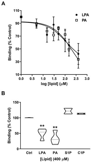 PA competes with LPA for binding to LPA receptors. (A) Myoblast membranes were incubated with 10 µM [3H]LPA in the presence of the indicated concentrations of unlabeled PA or LPA, as indicated. Non-specific binding was measured in the absence cell of membranes. Results are the mean ± SEM of three independent experiments performed in triplicate. Radioactivity of filter-bound radionuclide was quantified by liquid scintillation counting, as indicated in the Materials and Methods section. (B) The competition binding assays were performed with 10 µM [3H]LPA in the presence of 400 µM PA, 400 µM LPA, 400 µM S1P or 400 µM C1P, as indicated. Non-specific binding was measured in the absence of myoblast membranes. Results are the mean ± SEM of three independent experiments performed in triplicate. (** p < 0.01). Radioactivity of filter-bound radionuclide was quantified by liquid scintillation counting.