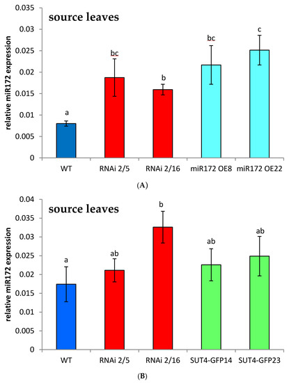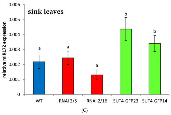 We were interested in quantification of the level of miRNA172 in StSUT4-silenced plants since morphological observations revealed that the phenotype of StSUT4 silenced plants is very similar to what was observed for miR172 overexpressing plants [10] regarding internode elongation, early flowering, tuberization under non-inductive conditions, etc., [1]. Comparing source leaf RNA, we observed a significantly increased level of miR172 in one out of two independent transformant lines with reduced levels of StSUT4 expression (RNAi 2/5 and RNAi 2/16) compared to WT plants (Figure 1A,B). As a positive control, 35S::miR172 overexpressing potato plants have been used that show an even stronger upregulation of miR172 accumulation (Figure 1A). No significant increase in miR172 levels was observed in StSUT4-GFP overexpressing plants (Figure 1B).