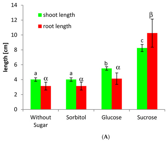 In order to test whether plant’s performance depend on the carbon source, we propagate potato cuttings under sterile in vitro conditions on different sugars or without any additional sugar supply in the medium. After 21 days of growth on Murashige and Skoog (MS) Medium, the plantlets growing on 80 mM sucrose containing medium behaved optimal with maximum plant height and maximum root length (Figure 3A,B), whereas plants grown on sorbitol containing medium or without any sugar supply remained much smaller.
