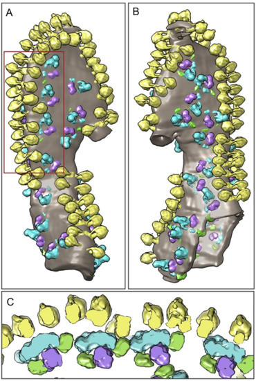 Surface rendering of the mitochondrial crista containing the oligomeric linear structure consisting of the respiratory chain and ATP synthases. (A,B) Views of the crista from the opposite sides (180° rotation around the vertical axis), demonstrating a highly ordered structure of the hypercomplex; (C) 3D visualization of respirasomes and the ATP synthases contact zones in the membrane. Slice of the fragment highlighted by the red frame in image (A). View from the opposite side of the membrane. Colors: yellow–ATP synthase, blue–complex I, purple–complex III dimer, green–complex IV.