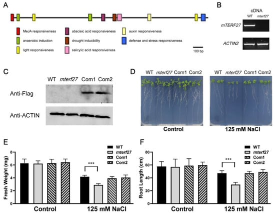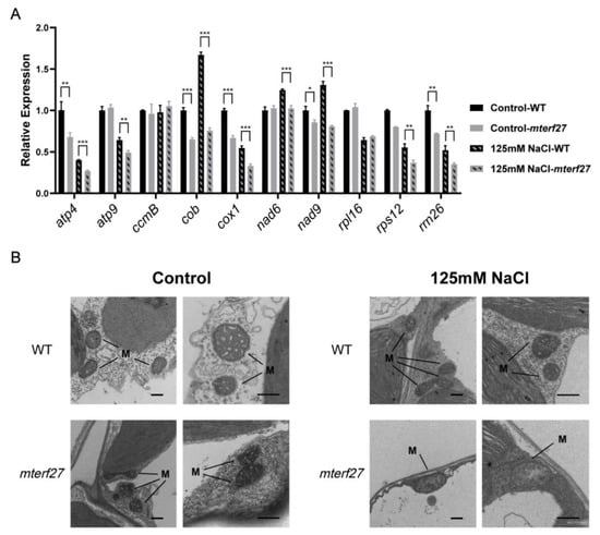 Jiang, D.; Chen, J.; Zhang, Z.; Hou, X. Mitochondrial Transcription Termination Factor 27 Is Required for Salt Tolerance in Arabidopsis thaliana. Int. J. Mol. Sci. 2021, 22, 1466. https://doi.org/10.3390/ijms22031466