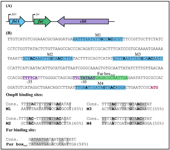 Analysis of the shotgun genome sequence of Y. enterocolitica strain Ye9N (2/O:9) (NCBI/GenBank Acc. No. NZ_JAALCX000000000.1) localized the fur gene, encoding the Fur repressor (an ORF of 447 nt, 148 aa), downstream of fldA, encoding flavodoxin I (175 aa), and upstream of chb, encoding chitobiase (891 aa) (Figure 1A). In silico analysis revealed that the fldA-fur-chb arrangement is highly conserved among Y. enterocolitica strains of different bio-serotypes and other pathogenic Yersinia species, i.e., Y. pestis and Y. pseudotuberculosis (Figure S1A). The fldA and fur ORFs are in the same transcriptional orientation, whereas chb is oriented divergently. The relatively long fldA-fur intergenic region (368 bp) suggests the potential for regulatory interactions. A putative promoter located upstream of fur (Pfur) was identified using the software BPROM [81]. The −10 and −35 core promoter motifs are located 84 and 107 nt upstream of the start codon of fur and show partial resemblance to the respective consensus sequences for E. coli σ70 RNA polymerase (TATAAT and TTGACA) (Figure 1B). This analysis also revealed the presence of one putative Fur-binding site (Fur boxYe9, 5′-TATAATGAGACGCAATTGA-3′) in the fur promoter, overlapping the −10 sequence, with 58% identity to the E. coli Fur box consensus sequence, a 19-nt inverted repeat (5′-GATAATGATAATCATTATC-3′) [25]. Interestingly, four possible 20-nt OmpR-binding sites (OBSs) were also identified in the Y. enterocolitica fur promoter region (Figure 1B). These putative OBSs, named M1, M2, M3 and M4, are centered at −331, −227, −191 and −20 bp relative to the start codon of fur and, respectively, exhibit 45%, 60%, 55% and 50% identity to the E. coli consensus sequence proposed by Maeda et al. 1991 [82]. Moreover, two of four OBSs (M2 and M4) and a Fur box were revealed in the fur regulatory region of Y. pestis and Y. pseudotuberculosis (Figure S1B).