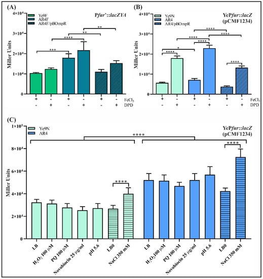 To determine the effects of these stresses on Ye9 fur expression, the plasmid-encoded YePfur::lacZ transcriptional fusion (pCMF1234) was used. In order to attribute changes in fur expression to OmpR, these experiments were carried out using both the wild type (Ye9N/pCMF1234) and ΔompR mutant (AR4/pCMF1234) grown in LB medium and in iron-limiting (150 µM DPD) conditions.