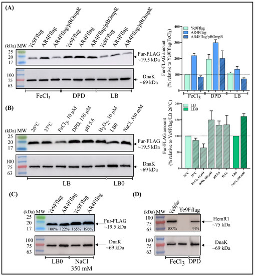 The abundance of Fur-3×FLAG was then checked in strains differing in OmpR content, i.e., Ye9Fflag (WT) and AR4Fflag (ΔompR), grown in LB0 and LB0 supplemented with NaCl (350 mM) (Figure 3C). Higher levels of Fur-3×FLAG were observed in the high-osmolarity medium (350 mM NaCl) regardless of the presence of OmpR, which suggested that osmoregulation occurs independently of this regulator.