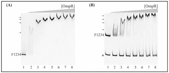- Huang, K.J.; Lan, C.Y.; Igo, M.M. Phosphorylation stimulates the cooperative DNA-binding properties of the transcription factor OmpR. Proc. Natl. Acad. Sci. USA 1997, 94, 2828–2832. [Google Scholar] [CrossRef] [PubMed]