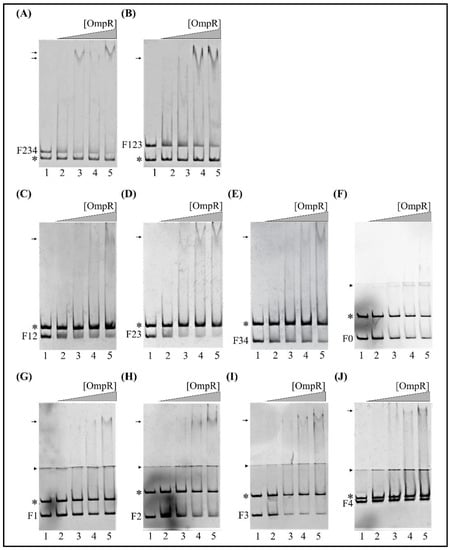 EMSAs of the interaction between OmpR-His6 and sub-fragments of the fur regulatory region carrying different numbers of potential OmpR-binding sites. (A,B) EMSAs with fur regulatory region DNA fragments comprising three potential OmpR-binding sites (OBSs): (A) lacking motif M1 from the 5′-end (F234, 321 bp) and (B) lacking motif M4 from the 3′-end (F123, 367 bp). (C–E) EMSAs with DNA fragments comprising two potential OBSs: (C) F12 (239 bp), (D) F23 (243 bp) and (E) F34 (214 bp). (F) EMSA with a DNA fragment lacking all OBSs. (G–J) EMSAs with DNA fragments containing one OBS: (G) F1 (153 bp), (H) F2 (115 bp), (I) F3 (136 bp) and (J) F4 (176 bp). In all cases, the DNA fragments were incubated without protein (lane 1) or with 0.65 (lane 2), 1.3 (lane 3), 1.95 (lane 4) or 2.6 μM (lane 5) OmpR-His6. Free DNA and protein/DNA complexes (arrows) are indicated. Fragments of 16S rDNA (*) were included in the reaction mixtures with the fur regulatory region fragments and served as a negative control. The OmpR/DNA complexes were resolved on a native polyacrylamide gel and detected by SYBR Green staining. In the EMSAs with very short DNA fragments (F–J), electrophoresis was performed on native polyacrylamide gels with two layers, i.e., a large pore 4.2% gel on the top and small pore 8.4% gel on the bottom, for better visualization of shifted complexes (arrowheads indicate the interface between the two gel concentrations).