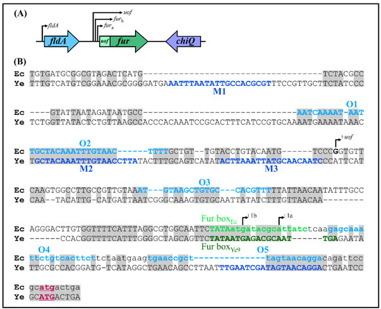 Comparison of the fur loci of Y. enterocolitica and E. coli. (A) Chromosomal organization of the E. coli fur locus. The direction of transcription from the fldA, uof and the two fur promoters is indicated by arrows (based on 47 and 85). The following products are encoded by these genes: fldA—flavodoxin I, uof—Fur leader peptide, fur—Fur (ferric uptake regulator), chiQ—chitosugar-induced lipoprotein. (B) Alignment of the fur regulatory regions of E. coli and Y. enterocolitica. Chromosomal sequences of E. coli (Ec) and Y. enterocolitica (Ye) extending from the end of the fldA gene to the start codon of fur (plus five nucleotides from the end of the uof gene present in E. coli) were aligned using BlastN. Identical nucleotides are shaded gray. The putative transcription start sites of E. coli fur (a and b) and uof are indicated by +la, + lb and +1uof, respectively. Putative OmpR-binding sites (M1–M4) from Y. enterocolitica are in dark blue text, while putative E. coli OmpR-binding sites (O1–O5) are in light blue. The Fur-binding sites (Fur boxEc and Fur boxYe9) are in light and dark green text, respectively. The sequence of E. coli uof is written in lowercase text. The fur translation start codons are in bold, underlined and colored pink.