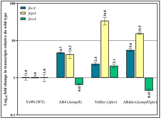 Initially, the levels of the fecA, fepA and feoA mRNAs were assessed by RT-qPCR in strains Ye9N (the wild-type strain), Ye9fur (Δfur), AR4 (ΔompR) and AR4fur (ΔompRΔfur). The Δfur::Gm mutants of Y. enterocolitica Ye9N (Ye9fur) and AR4 (AR4fur) were constructed by homologous recombination as described previously [15]. The obtained data show an increase in the mRNA transcript level of 2.4-fold for fecA and 34-fold for fepA in the Ye9fur strain (Δfur background) compared to the wild-type strain, indicating Fur-mediated repression of both genes (Figure 10). In strain AR4 (ΔompR background), the fecA and fepA transcript levels were increased 4.7-fold and 4.3-fold, respectively, relative to the wild-type strain, indicating that OmpR has a negative impact on fecA and fepA expression. Interestingly, the upregulation of fecA in the ΔompR background was 2-fold higher than that observed in the Δfur background and did not really change when these mutations were combined (ΔompRΔfur), indicating that the inhibitory effect of OmpR exceeds the repressive activity of Fur and can be observed regardless of Fur (Figure 10). In contrast, the strain devoid of Fur (Δfur background) exhibited 8-fold higher fepA expression than that lacking OmpR (ΔompR background). However, the combination of both mutations (ΔompRΔfur) led to a 2-fold decrease in the fepA transcript level, suggesting that OmpR may have a positive impact on fepA expression in the absence of Fur (Figure 10). Regarding the expression of the third tested gene, a 2.1-fold increase in feoA transcripts was observed in a Δfur background relative to the wild-type strain, indicating inhibition of feoA expression by Fur (Figure 10). In turn, the feoA mRNA level decreased slightly in the ΔompR genetic background in comparison to the wild type, indicating a weak positive influence of OmpR. Interestingly, in the double mutant (ΔompRΔfur), a ~4-fold decrease in the feoA mRNA transcript relative to the Δfur background was observed, resulting in levels equivalent to those in the ΔompR background. Thus, it seems that upregulation of feoA by OmpR may abolish Fur repression.