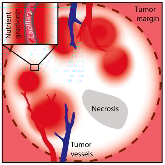 Although angiogenesis, the growth of new blood vessels, is induced already in small tumors, the supply with nutrients and oxygen is frequently poor in solid cancers. The newly formed vascular network is aberrant and irregular, resulting in poor perfusion, fluctuating blood flow and increased interstitial pressure [18,19,20,21]. In fact, dynamic contrast material-enhanced (DCE) magnetic resonance imaging shows a very heterogenous pattern of perfusion of solid cancers like breast cancer and lung cancer [22,23]. The spatial and temporal microvascular insufficiency and the rapid consumption by the proliferating cancer cells both result in steep gradients for glucose and other nutrients [18,19,20,21]. Together, these factors lead to a highly heterogenous metabolic tumor microenvironment (Figure 1). Importantly, nutrient availability is one of the most important determining factors for cancer cell metabolism and acts together with intrinsic factors, such as activation of oncogenes or mutations of genes encoding for metabolic enzymes [24,25]. On the other hand, the selection for certain oncogenes may be favored by stress conditions in the extracellular milieu, e.g., glucose limitation [26].